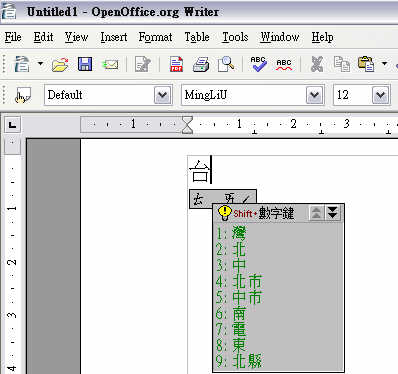 3. Po wprowadzeniu tonu (1-4) sylaba pinyin zamieni się na znak pisma chińskiego.Będzie to najczęściej używany znak – inne propozycje do wyboru pojawią się w poziomej tabelce. Aby zobaczyć lub wybierać inne znaki, należy nacisnąć przycisk „Page Up” i „Page Down”. Wtedy pojawi się lista znaków wymawianych we wpisany przez nas sposób.