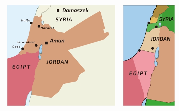 Ryc. 1. Dwa scenariusze alternatywnej historii: przegranej przez Izrael wojny 1948 roku i podziału Lewantu między państwa arabskie. Prawdopodobna nazwa zwycięskiego Jordanu: Królestwo Palestyny i Jordanu.