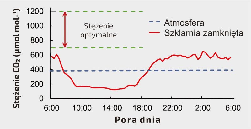 Odpowiedź na tytułowe pytanie: „tak”. Stężenie CO2 w atmosferze to około 400 μmol/mol-19. W uprawach szklarniowych notuje się gwałtowne spadki stężenia CO2 w czasie dnia, kiedy rośliny w procesie fotosyntezy pozyskują z powietrza węgiel do budowy swoich tkanek (Ryc. 1). Optymalne stężenie dla wzrostu roślin to 800-1200 ppm. Aby podnieść zawartość dwutlenku węgla w czasie dnia właściciele szklarni stosują dwie taktyki: wentylację lub dostarczanie CO2 z zewnętrznego źródła.